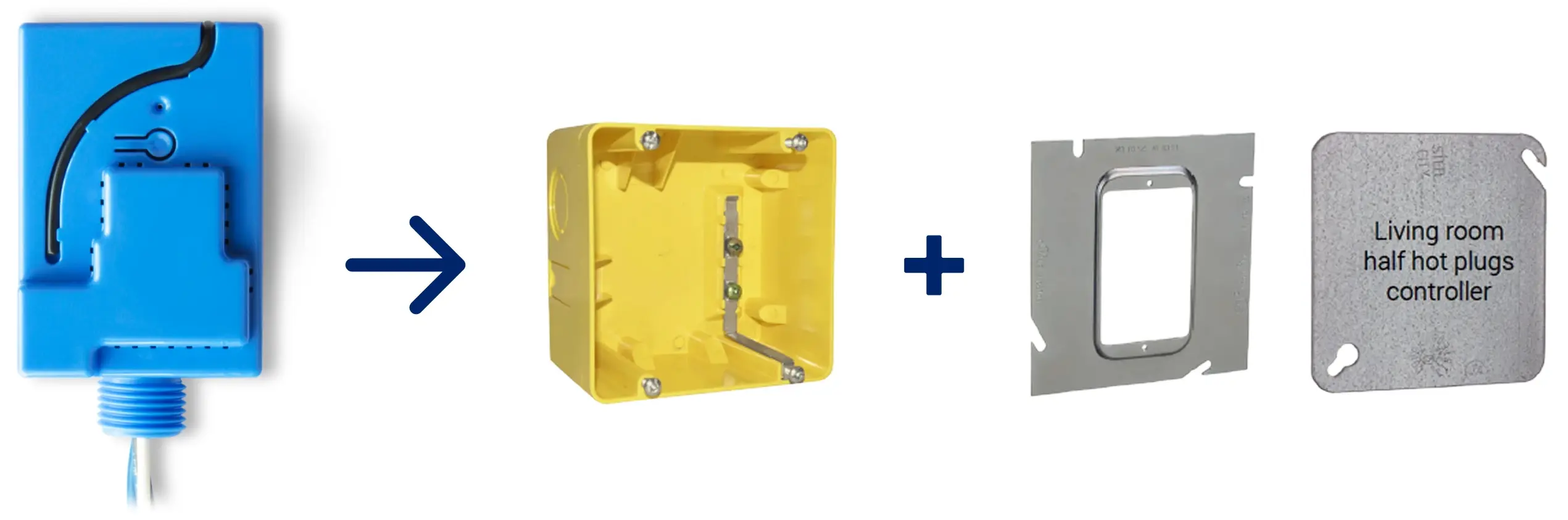 A single-output power controller counts as two conductors in box fill. Use minimum 25 cubic inch deep plastic boxes (such as NuTek WOCT or similar for your locale).